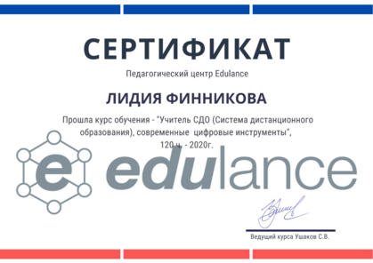Сертификат по общим дисциплинам - Обществознание, учитель СДО (Система дистанционного образования). Педагогический центр Edulance.